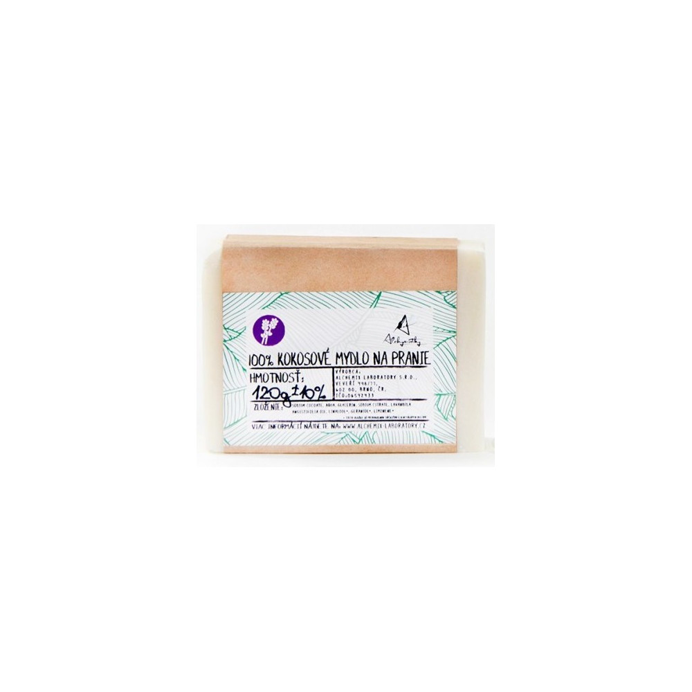 Alchymistky 100% kokosové mýdlo je jedna z nejlepších voleb pro šetrné a ekologické praní. Mýdlo obsahuje citrát sodný, který je účinný změkčovač vody. Váže na sebe ionty vápníku a hořčíku a umožňuje mýdlu lépe prát i v tvrdé vodě. Tato varianta produktu je s vůní levandule pocházející z esenciálních olejů, díky čemuž je obzvlášť vhodné na praní ložního prádla.